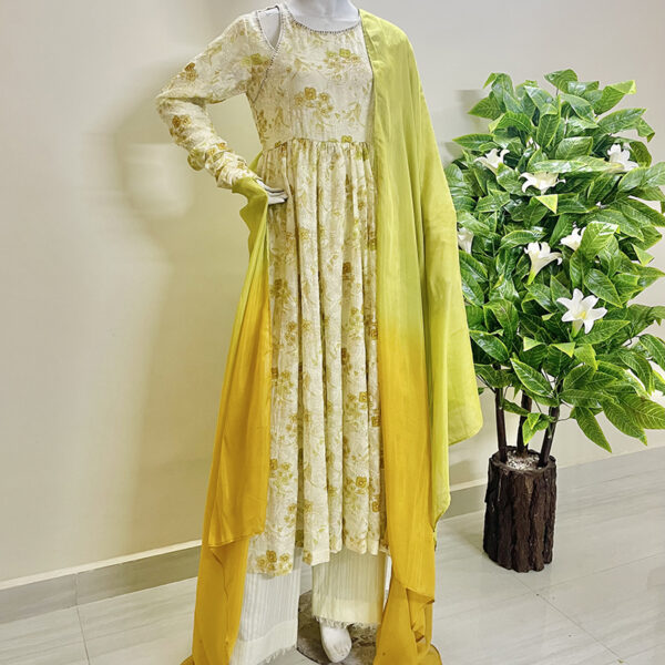 This dress is a beautiful representation of traditional elegance with a contemporary flair. Made from lightweight, floral-printed silk fabric with a cream base and delicate golden accents. The floral motifs on this long flowy frock evoke a soft and sophisticated charm, perfect for festive or casual events. The full-length sleeves and round neckline with a half-cut are modestly styled with intricate embroidery detailing near the shoulders, adding a touch of modern chic to this three-piece garment. This outfit paired with a textured wider straight pants in a matching cream color, adorned with thread trim at the hem. The gradient effect of this silk dupatta transitions from soft yellow to a lighter green shade bringing a pop of color and vibrancy to the outfit.